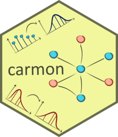 Here is an example of the typical usage of carmon to reconstruct a multi-omics network. For a more customized use of the package, please see vignette("carmon"). The main function of the package is carmon(), a single wrapping function encompassing all the modules of the package. When the input data are properly formatted, carmon() only needs them as a mandatory argument. They should be preferably provided in the form of a named R list, with each element being the data set of an omics layer, named in the R list after the omics type it contains. The available omics types for which carmon has been specifically tailored, together with their accepted synonyms, are shown by the function which_omics(). The package expects every omics layer to be perfectly source-matched. This means that every variable of every omics layer must have been measured for the same individual/sample/observation/replicate. The package provides a few examples of multi-omics data sets formatted according to carmon’s standard. In this example we use the small data set already provided by the package, multi_omics_small.