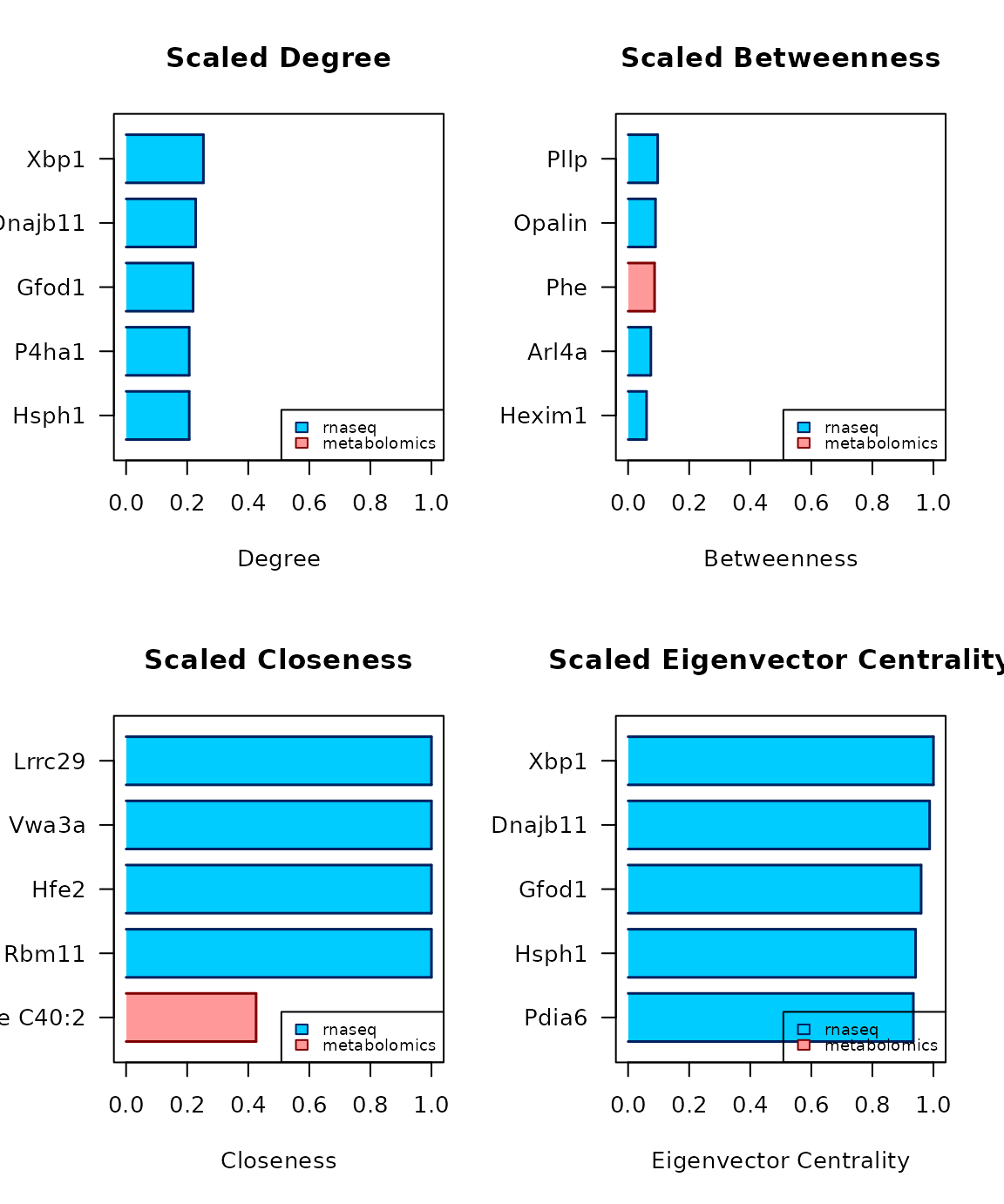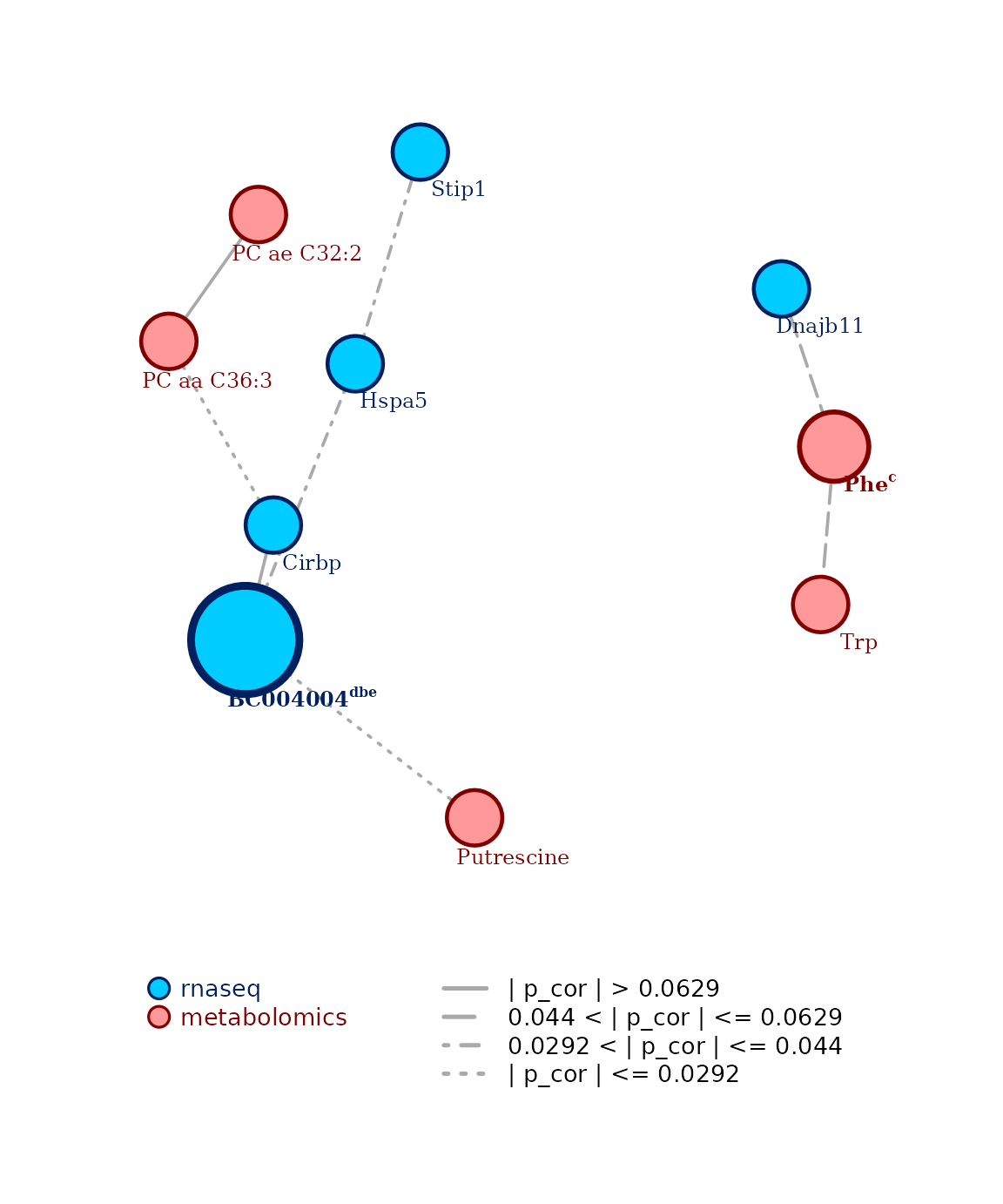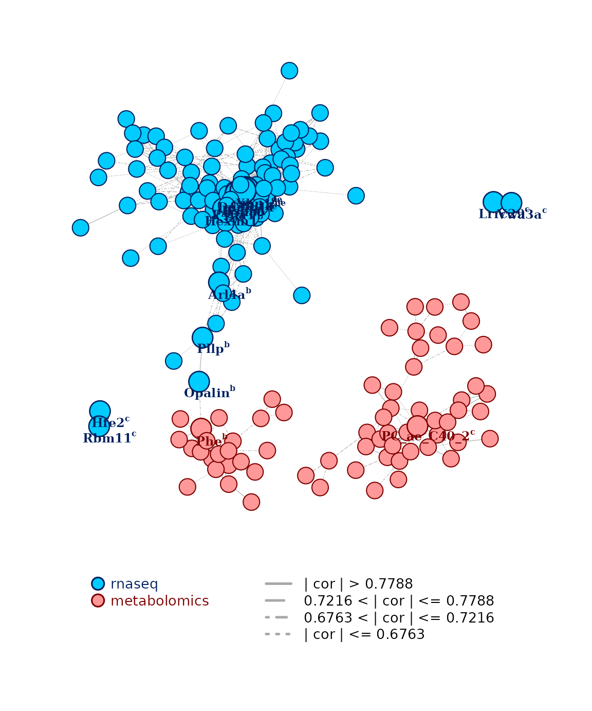 multi_omics_small <- list("rnaseq" = layer_1, "metabolomics" = layer_2)Carmon to perform copula-aided reconstruction, analysis and plot of a multi-omics network